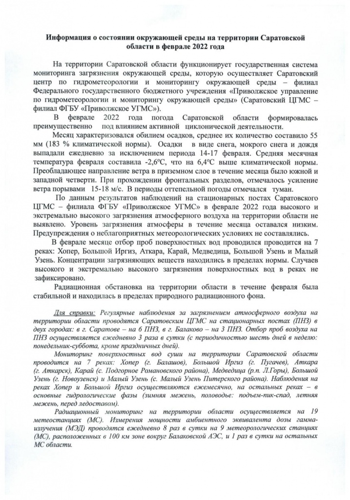 Информация о состоянии окружающей среды на территории Саратовской области в феврале 2022 года