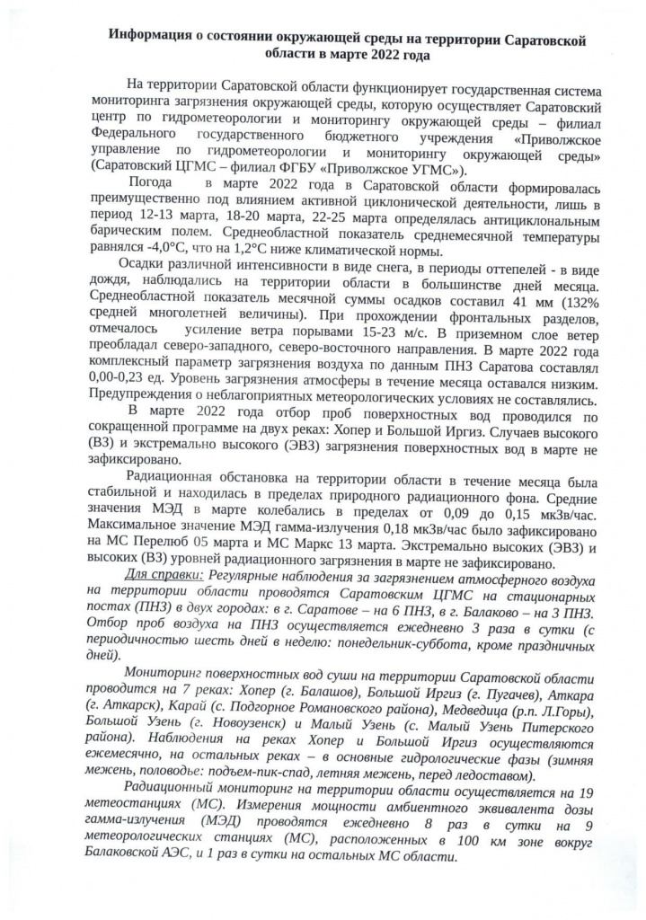 Информация о состоянии окружающей среды на территории Саратовской области в марте 2022 года