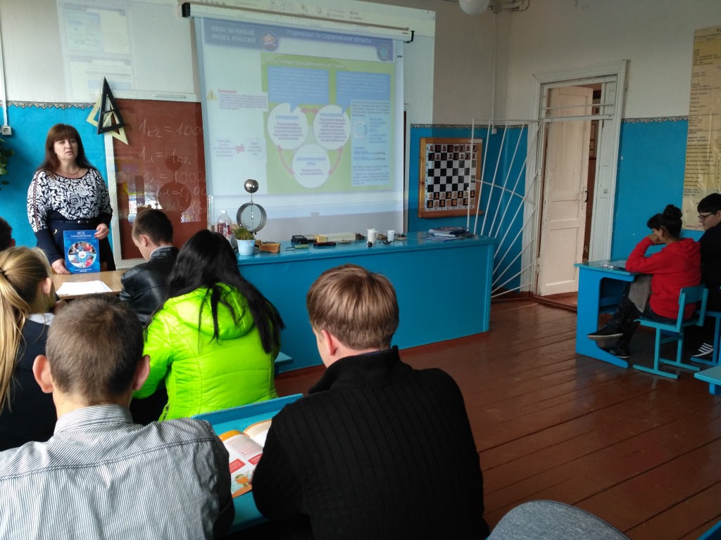 28 сентября 2017 года, в рамках образовательной программы по повышению пенсионной и социальной грамотности молодежи начальник Управления ПФР в Екатериновском районе Саратовской области Анна Алексеевна Стрельцова провела урок для старшеклассников школы села Вязовка.