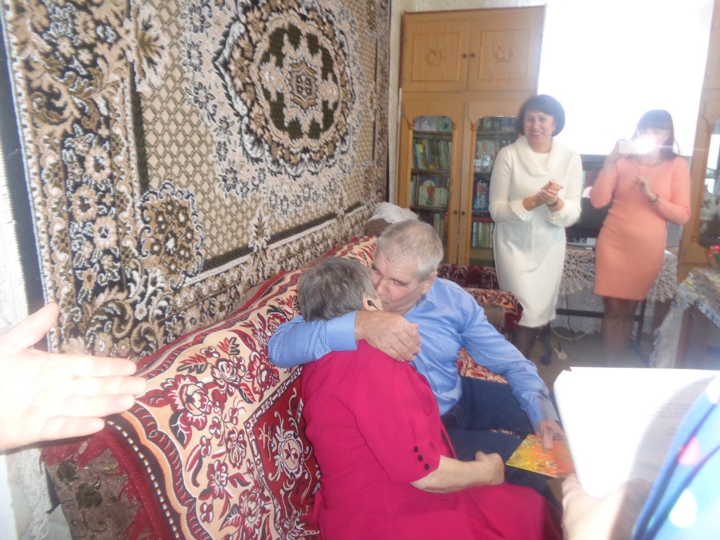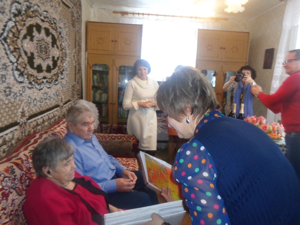 Лидия Инокентьевна рассказала о том как познакомились с Иваном Егоровичем, как ждала его с армии, как появилась на свет их первая дочь. В их семье три дочери, внуки и уже есть правнуки, но к сожалению на праздник смогла приехать только младшая дочь Галина с мужем и дочерью Аленой. Несмотря на свой возраст и состояние здоровья Лидия Инокентьевна и Иван Егорович очень веселые, бодрые, шутят и даже поют песни.