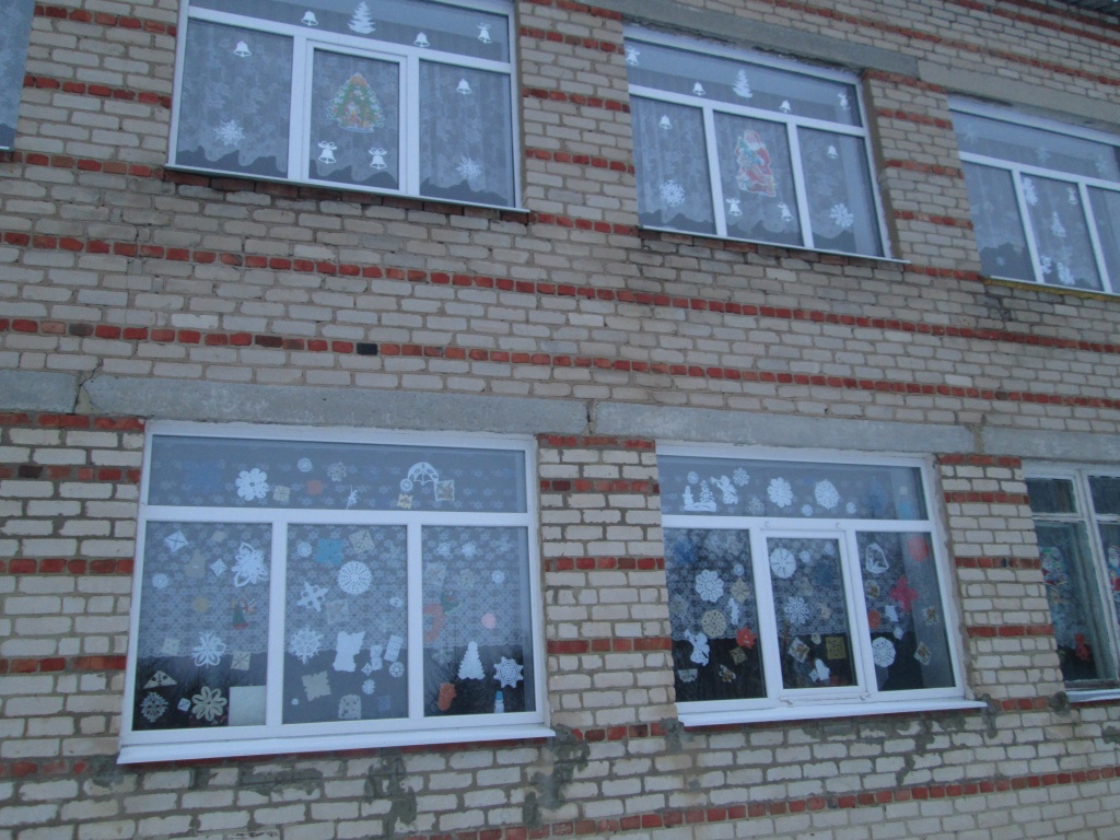 На окнах кабинетов средней школы с. Альшанка красуются герои мультфильмов и сказок, а в вечернее время они переливаются разноцветными огнями гирлянд, как и все здание школы.