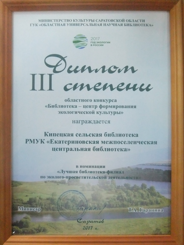 По итогам конкурса Кипецкая библиотека Екатериновского района награждена Дипломом III степени за реализацию библиотечной программы по экологическому просвещению «Приоткроем дверь в мир природы»