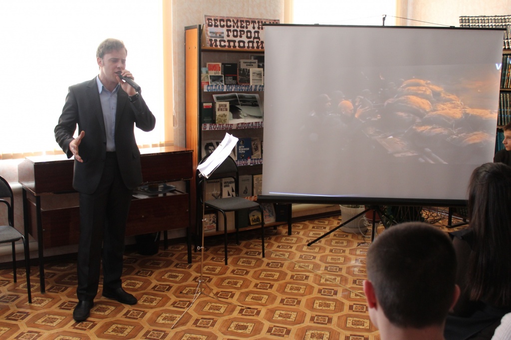 Одно из мероприятий этого Дня - тематический вечер «Горят гвоздики на снегу…», посвящено памяти и мужеству русских солдат, командиров.В ходе вечера прозвучали: рассказ о ходе Сталинградской битвы, песни в исполнении работников РДК, а также стихи и отрывки из произведений русских писателей и воспоминаний участников сражения. А использование документальных кадров из видеоархива Центральной библиотеки с воспоминаниями наших земляков – участников защитников Сталинграда было значимым дополнением в проведении мероприятия.