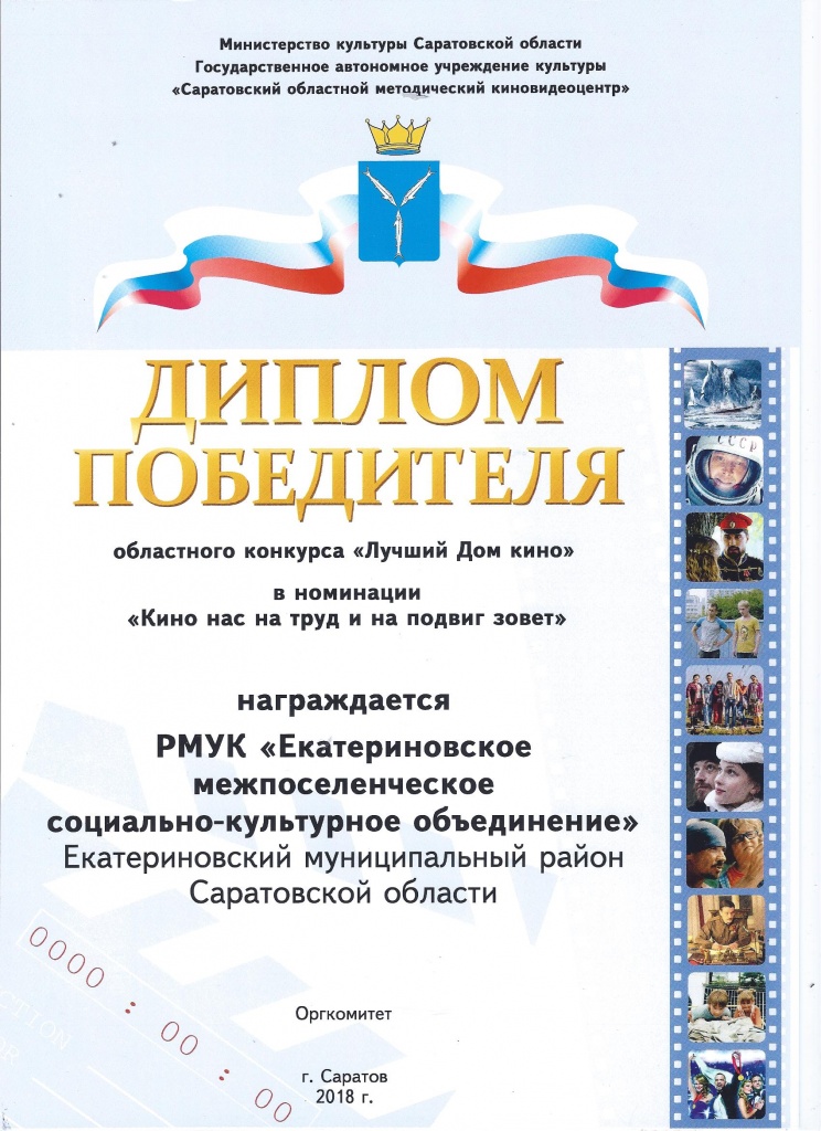 Благодарственным письмом министерства культуры Саратовской области, за добросовестный труд и вклад в развитие культуры области были награждены работники отдела кино РМУК «ЕМСКО» методист отдела кино - Михайлова С.Ю. и киномеханик СДК п.Индустриальный – Рожкова А.Г.. Надеемся, что и в дальнейшем работа нашего отдела кино будет яркой, разнообразной и не менее заметной. Удачи и творческих успехов дорогие наши фанаты отечественного киноискусства.