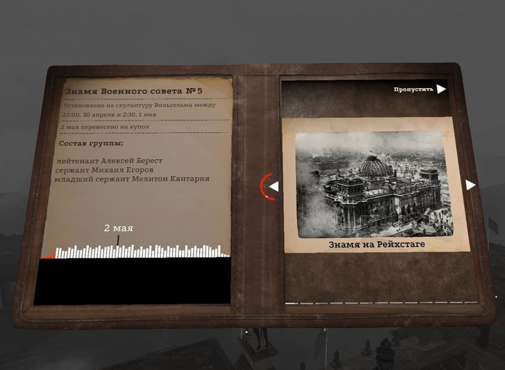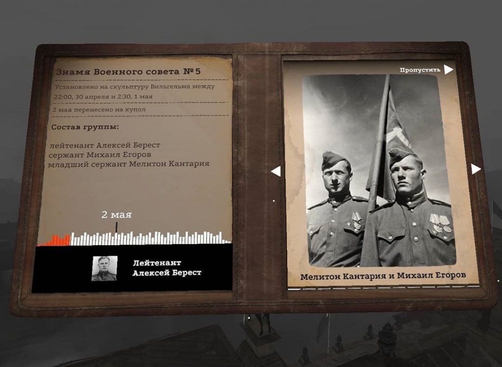 Проект воссоздает события 30 апреля – 2 мая 1945 года. В первой сцене проекта пользователь видит реальность глазами одного из бойцов Красной армии, его задача – установить Знамя Победы. Во второй рассказывается история дюжины красных стягов, взвившихся над поверженной столицей Третьего рейха.