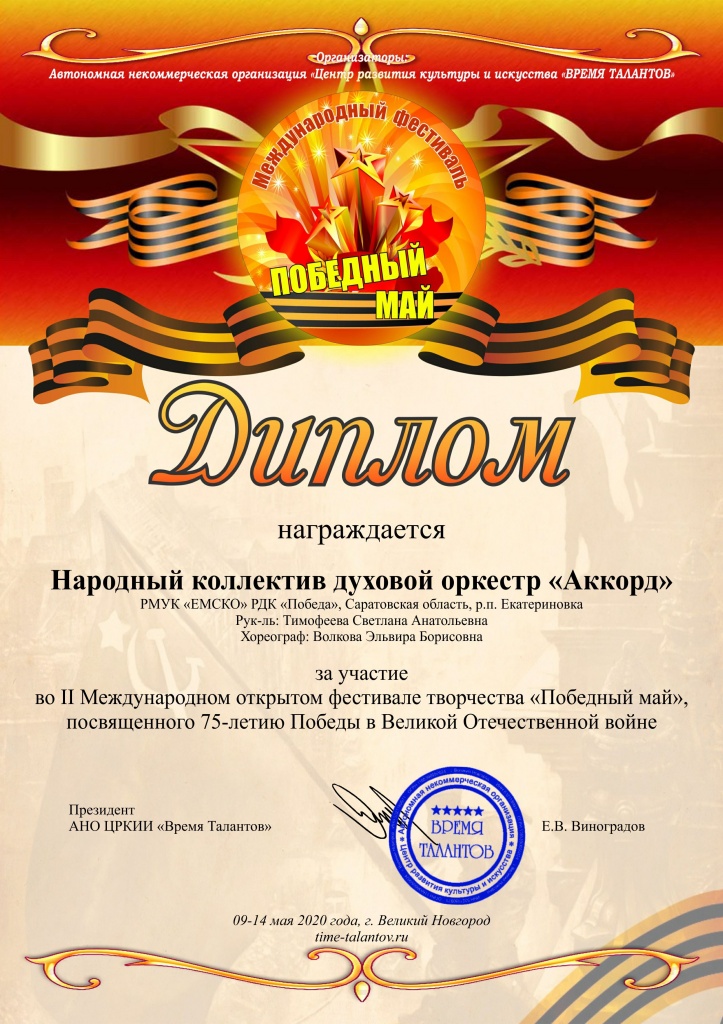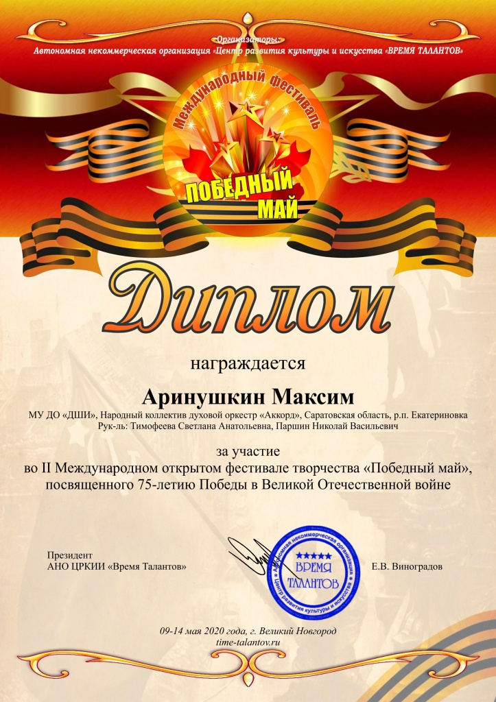 Организаторами фестиваля являются, Автономная некоммерческая организация «Центр развития культуры и искусства «ВРЕМЯ ТАЛАНТОВ» г. Великий Новгород. Всероссийский открытый фестиваль творчества «Победный май» проводился как военно-патриотическая акция с целью возрождения патриотических традиций, традиций преемственности поколений, сохранения духовных ценностей, активного общения представителей разных поколений в дистанционном (заочном) формате.