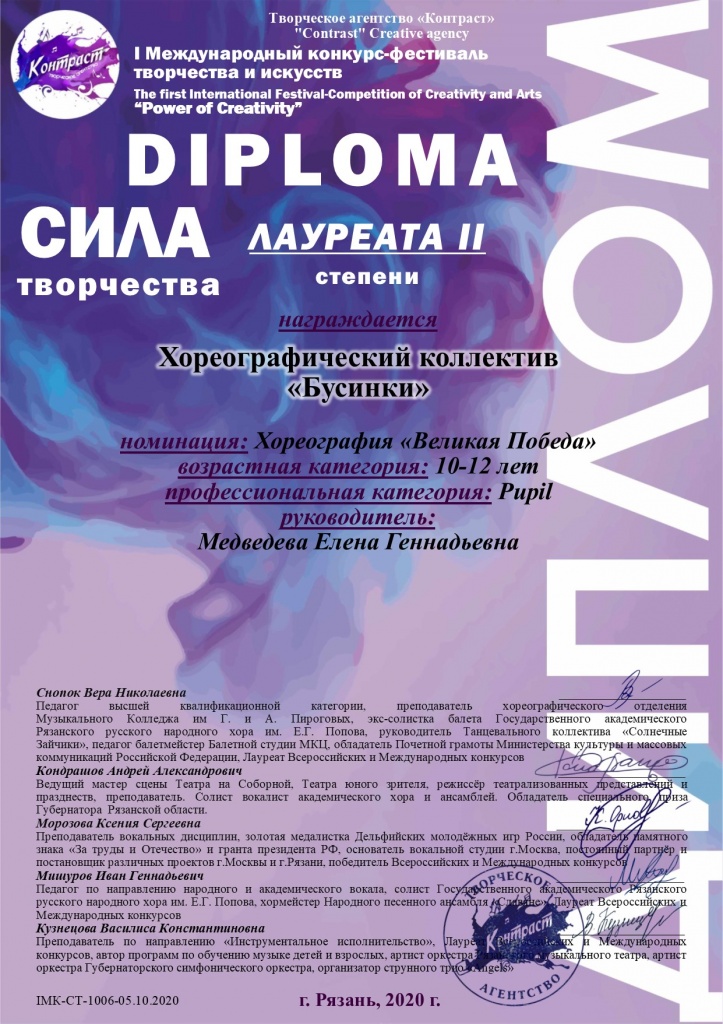 Участие в I Международном конкурсе-фестивале творчества и искусств «Сила творчества», организованном Творческим агентством «Контраст», г. Рязань принесло коллективу «Бусинки» новую победу. Жюри конкурса удостоило выступление ребят Диплом Лауреата II степени.