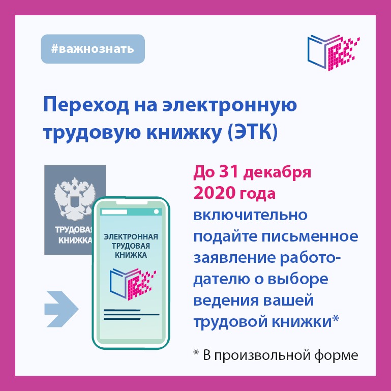 Напомним, что не позднее 31 декабря 2020 года каждому работающему по трудовому соглашению работнику необходимо сделать свой выбор между ведением трудовой книжки в бумажном виде или в электронном формате. Для работников переход к новому электронному формату сведений о трудовой деятельности добровольный и осуществляется с согласия человека.