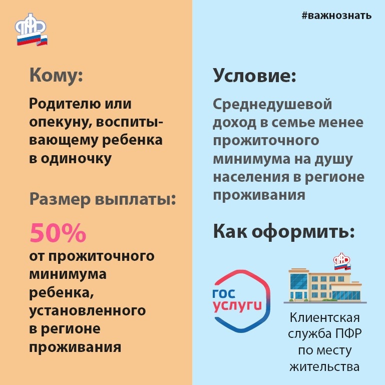 Согласно поправкам, внесенным в федеральный закон «О государственных пособиях гражданам, имеющим детей», новые выплаты будут предоставляться маме или папе, в одиночку воспитывающим детей 8–16 лет, а также женщинам, вставшим на учет в медицинскую организацию в ранние сроки беременности. Размер обеих выплат определяется в соответствии с прожиточным минимумом, установленным в каждом регионе. В случае с выплатой неполным семьям речь идет о 50% прожиточного минимума ребенка, в случае с выплатой по беременности – 50% прожиточного минимума трудоспособного взрослого.