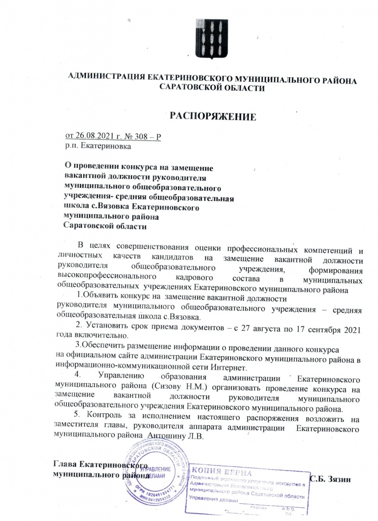 Информационное сообщение о проведении конкурса замещение должности директора муниципального общеобразовательного учреждения - средняя общеобразовательная школа с. Вязовка Екатериновского района Саратовской области