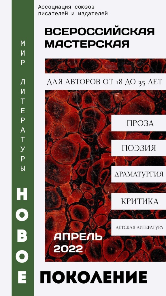 К участию в конкурсе «Мир литературы. Новое поколение» приглашаются авторы в номинациях «проза», «поэзия», «критика», «драматургия», «детская литература», 170 лучших участников получат возможность попасть на Всероссийскую мастерскую для молодых авторов в апреле 2022 года в Москве. Заявки на конкурс принимаются до 15 января 2022 года.