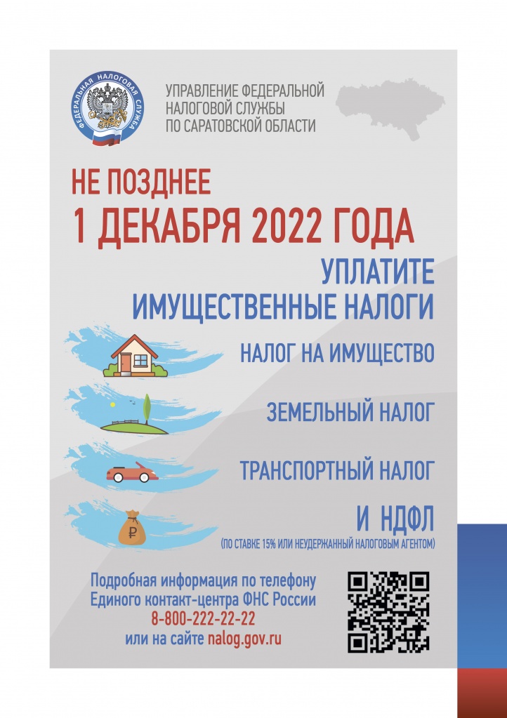 УФНС России по Саратовской области напоминает налогоплательщикам региона о том, что в этом году заплатить имущественные налоги необходимо в срок не позднее 1 декабря 2022 года.Налоговые органы уже направили налогоплательщикам региона по почте 1 млн налоговых уведомлений. Еще 350 тысяч уведомлений размещено в электронном сервисе ФНС России «Личный кабинет налогоплательщика для физических лиц».