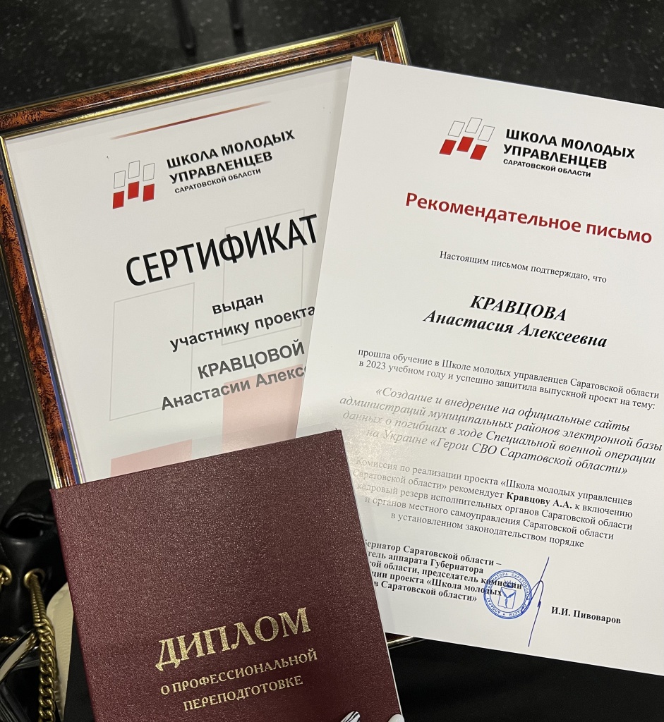 Проектная работа Анастасии Кравцовой «Герои СВО Саратовской области» получила высокую оценку и решением аттестационной комиссии, Анастасии Кравцовой было выдано рекомендательное письмо для включения в кадровые резервы органов исполнительной власти области, органов местного самоуправления Саратовской области, резерв управленческих кадров Саратовской области, как наиболее отличившейся в процессе обучения, подготовки и защиты проектной работы.