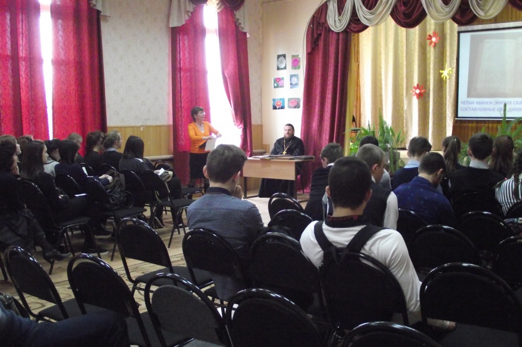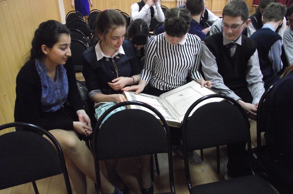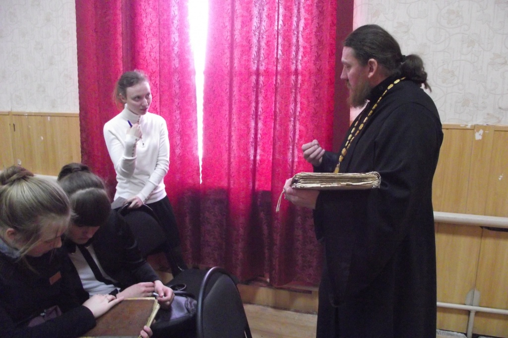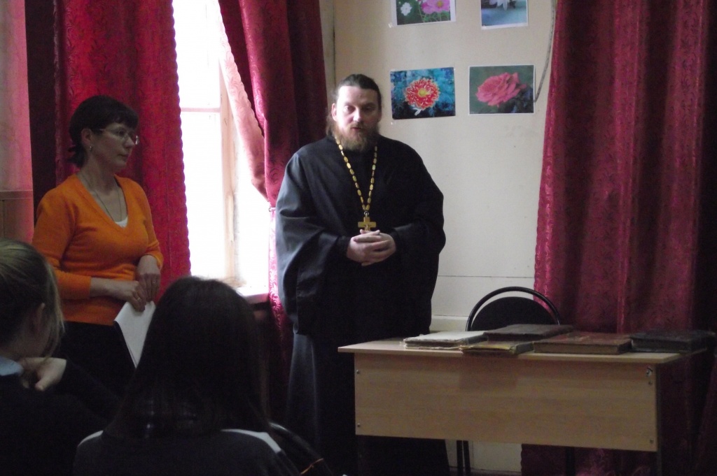 Ребята познакомились с историей книгопечатания на Руси, с непростой судьбой первопечатника Ивана Федорова, его первой печатной книгой «Апостол». Рассказ сопровождался электронной презентацией. На мероприятии присутствовал настоятель храма святой великомученицы Екатерины протоиерей Иоанн Бештень. Он познакомил ребят со старинными церковными книгами. В процессе разговора ребятам было предложено полистать страницы богослужебных книг. Священник в своем выступлении отметил, что вера православная воспитывает в человеке ценнейшие нравственные качества - любовь, терпимость, милосердие. В заключение мероприятия отец Иоанн ответил на вопросы, посвященные вопросам веры. Надеемся, что каждый из присутствующих смог открыть для себя что-то новое, нашел ответы на волнующие вопросы, которые таятся в книгах и содержат в себе «сердцу полезное слово».