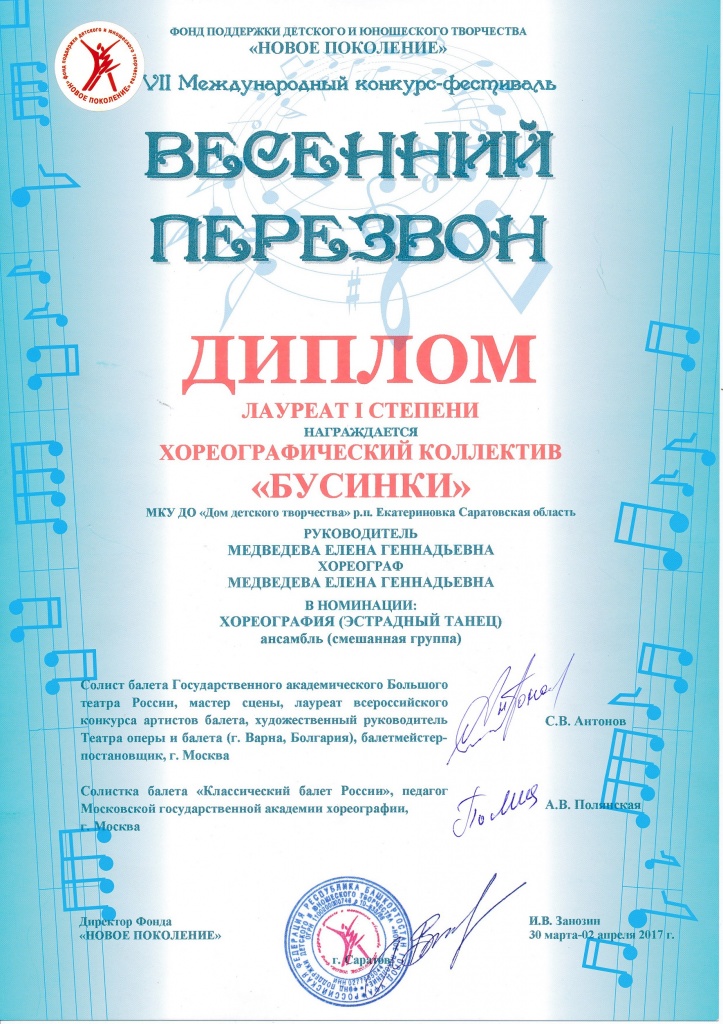 Звание Лауреата 1 степени и статуэтка Золотой звезды стали наградой за дисциплину и труд юных танцовщиков. Наши «Бусинки» стали единственным коллективом в номинации «Хореография», приглашенных для участия в Гала-концерте конкурса, который состоялся 02 апреля. Став обладателями призового места, коллектив получил право на участие в конкурсе Финал проекта «ЛУЧШИЙ ИЗ ЛУЧШИХ», который состоится в июле на Черноморском побережье. Мы искренне благодарны главе Екатериновского муниципального района Сергею Борисовичу Зязину за финансирование поездки, начальнику управления культуры Светлане Николаевне Иванушкиной за чуткость и отзывчивость, водителю АТП Сергею Брагину за профессионализм. От лица директора «Дома детского творчества» Т.В. Михайловой выражаем огромную благодарность родителям детей коллектива «Бусинки» за инициативу, поддержку и замечательное воспитание своих детей.