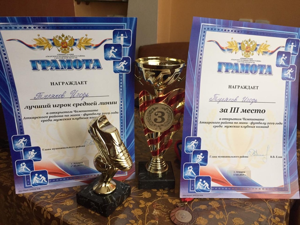 ![]() ![]() ![]() | 3, 16, 17 марта в г.Аткарске проходил открытый чемпионат Аткарского района по мини-футболу. В турнире принял участие и Екатериновский "Каскад": Туляков Игорь, Сотников Алексей, Аванесян Арман, Кочнов Алексей, Туляков Артем, Толстов Владислав, Бакакин Алексей, Кузнецов Семен, Рыжов Александр, Самсонов Владимир. 12 игр отыграли наши футболисты тем самым заняв 3 место в чемпионате. Туляков игорь стал лучшим игроком. |