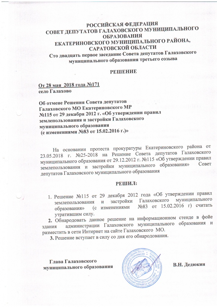 от 28 мая 2018 года №171 Об отмене Решения Совета депутатов Галаховского МО Екатериновского МР №115 от 29 декабря 2012 г. "Об утверждении правил землепользования и застройки Галаховского муниципального образования (с изменениями №83 от 15.02.2016 г.)"
